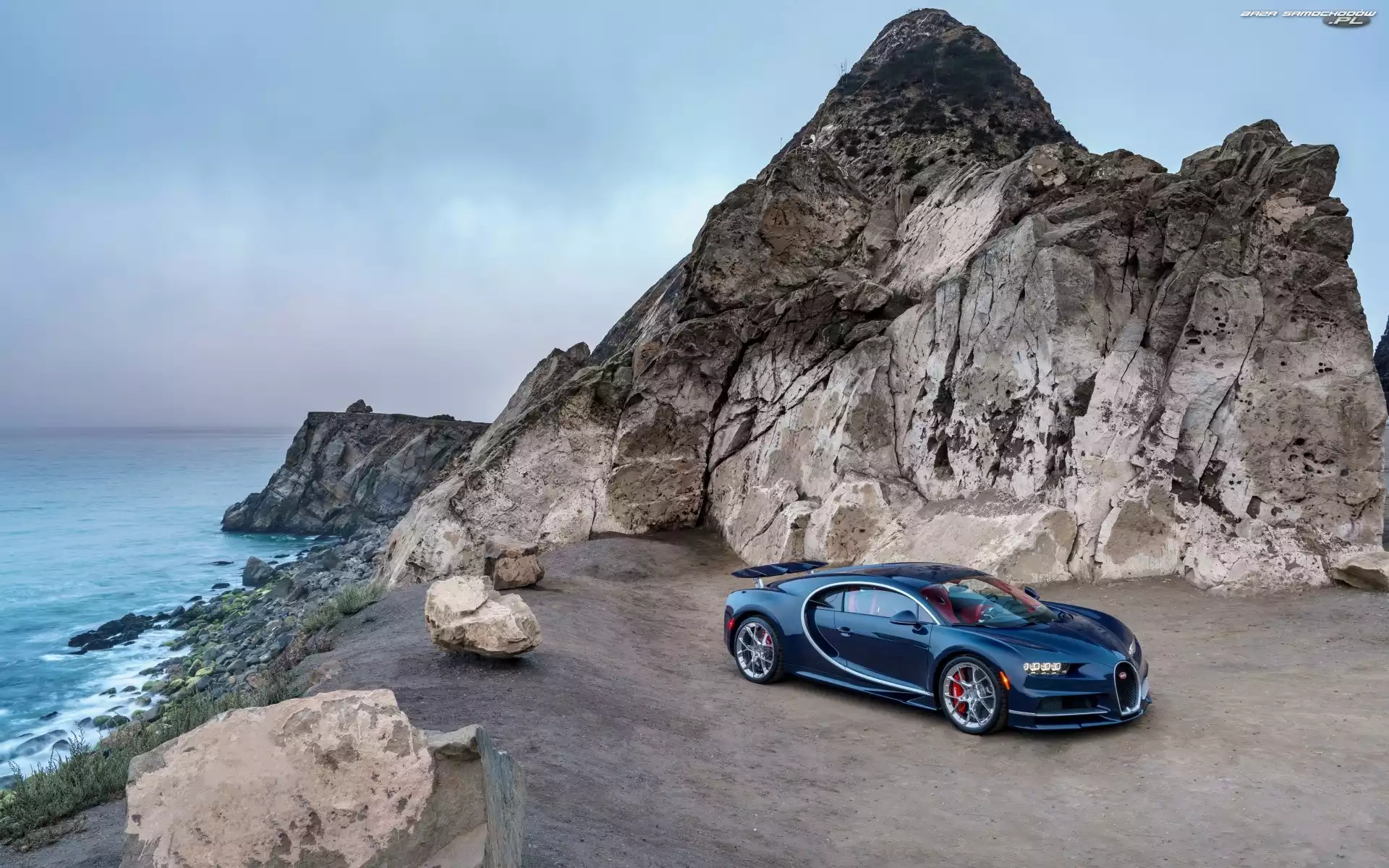 Samochód: Kamienie, Bugatti Chiron, Skały, Morze